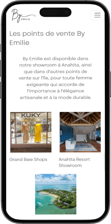Points de Vente : Les visiteurs peuvent trouver les points de vente de ByEmilie, notamment le showroom à Anahita et d'autres points de vente sur l'île Maurice.