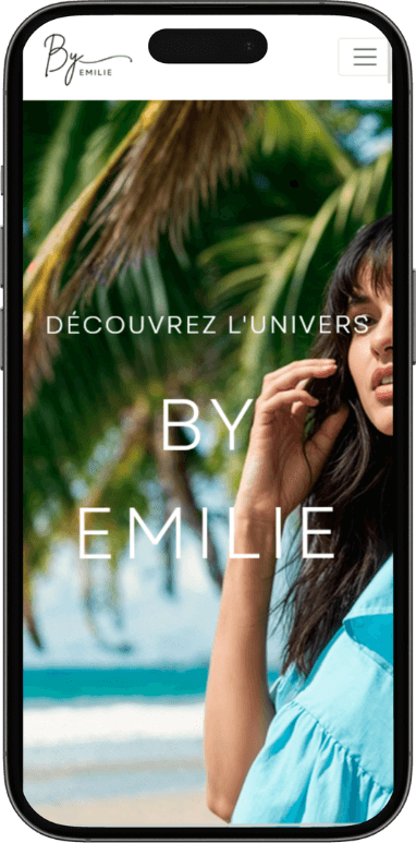 Présentation de l'Univers ByEmilie : Le site accueille les visiteurs avec une section dédiée à l'univers de la marque, mettant en avant l'élégance et le style unique de ByEmilie.