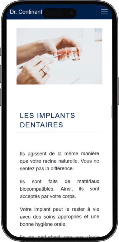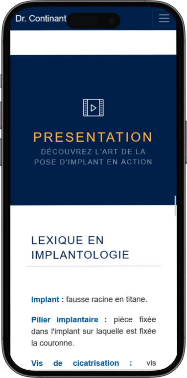 Le site web du Dr. Maximilien Continant est un outil essentiel pour la présentation des services et des informations du cabinet dentaire. En tant que site vitrine statique, il offre une solution simple et efficace pour mettre en avant les compétences et les technologies du cabinet sans nécessiter de mises à jour fréquentes. Ce type de site est idéal pour une activité comme celle du Dr. Continant, où le contenu n'a pas besoin d'être administrable, permettant ainsi de se concentrer sur la qualité des soins offerts aux patients.