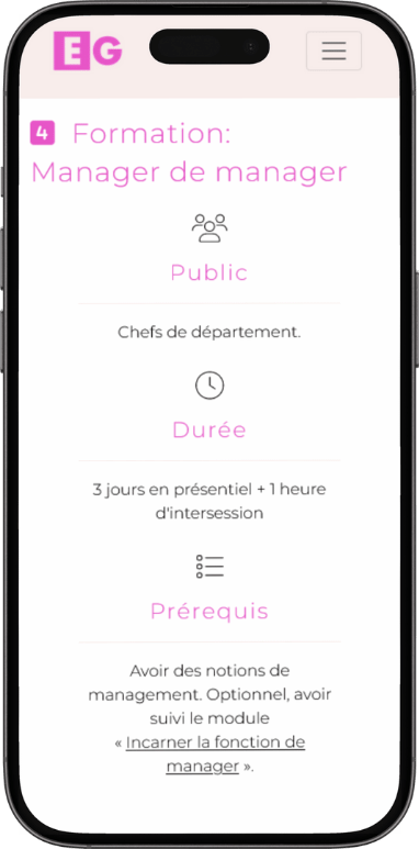 Avec 18 ans d'expérience, EG Formation, dirigée par Emmanuel Gaydon, est un organisme de formation en management spécialisé dans l'accompagnement des managers de proximité et de leurs supérieurs hiérarchiques.